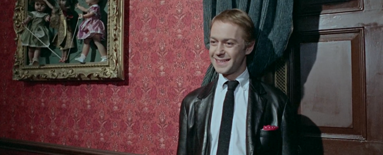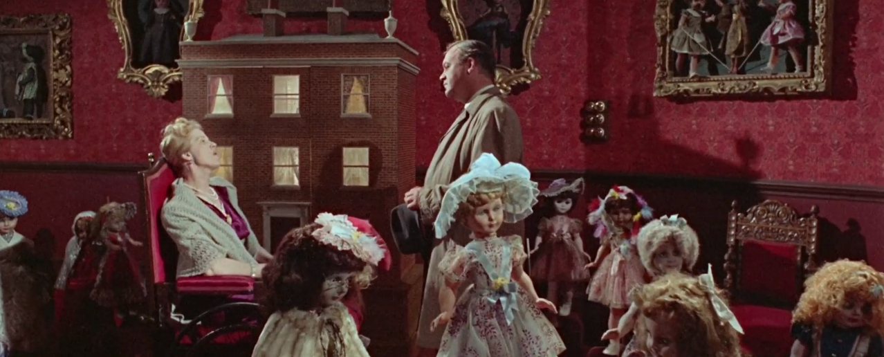 Conflicted by his repressive life, torn by his devotion to his doll-collecting Mutter, who spends her time making her unique dolls, Mark lurks on screen like a more swishy Londoner version of Norman Bates. When questioned by Inspector Holloway, Mrs. Von Sturm instantly recognizes one of the dolls left at the murder scene as being the likeness of her solicitor. Mark explains to Holloway… “Her world collapsed when my father died, so she built a new one out of her imagination.”