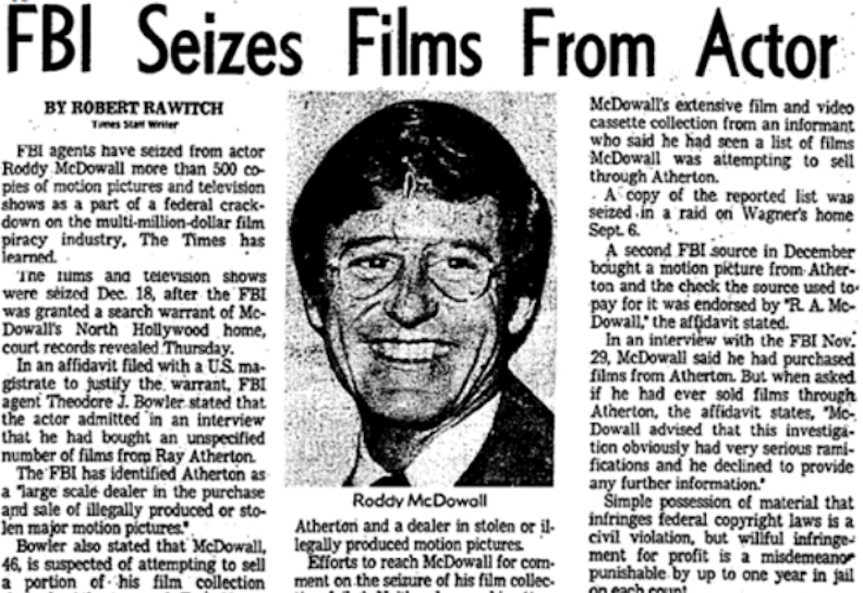 In 1974, the FBI raided McDowall’s home, seizing 160 16mm prints and over 1,000 videocassettes valued at $5 million during a copyright infringement and movie piracy investigation. Industry representatives valued the collection at $5,005,426, including classic films and television series. Despite the raid, McDowall was not charged and agreed to cooperate fully with the authorities.