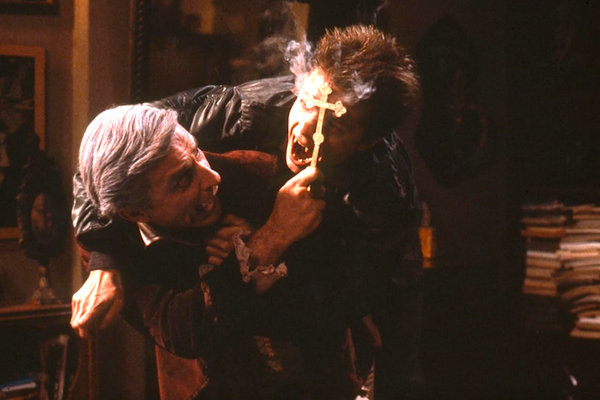 Peter Vincent : [brandishing a crucifix] Back, spawn of Satan!