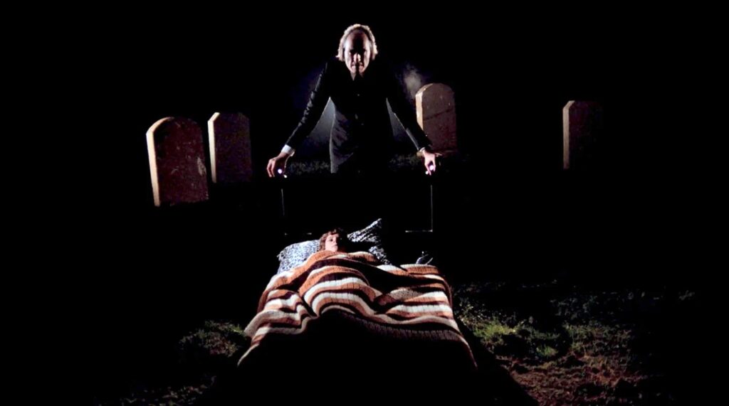 One of Phantasm’s most unforgettable moments comes when Mike lies in bed, trying to convince himself that the terrors of the day are behind him. Night presses in around his bedroom. The room is dark and still, the black is as thick as velvet. There’s a kind of quiet that makes every shadow seem alive, like an uneasy breath. He lies rigid beneath the covers, eyes wide and searching the gloom of darkness for shapes that shouldn’t be there. The darkness at the foot of his bed sits atop soil and grass, and the cold earth below seems to ripple, like a black tide-gathering force. With tombstones surrounding Mike in a ceremonial circle, the Tall Man hovers, summoning up his minions. An impossible pale collection of hands and small black hoods emerge from the inky voice, their fingers stretching, reaching out, surrounding his bed and grabbing at him, yanking him down toward the abyss that yawns beneath his bed. His cry is swallowed by the darkness, his body dragged into nightmare’s waiting maw as if the shadows themselves have come alive to claim him. In that moment, the boundaries between waking and dreaming dissolve.