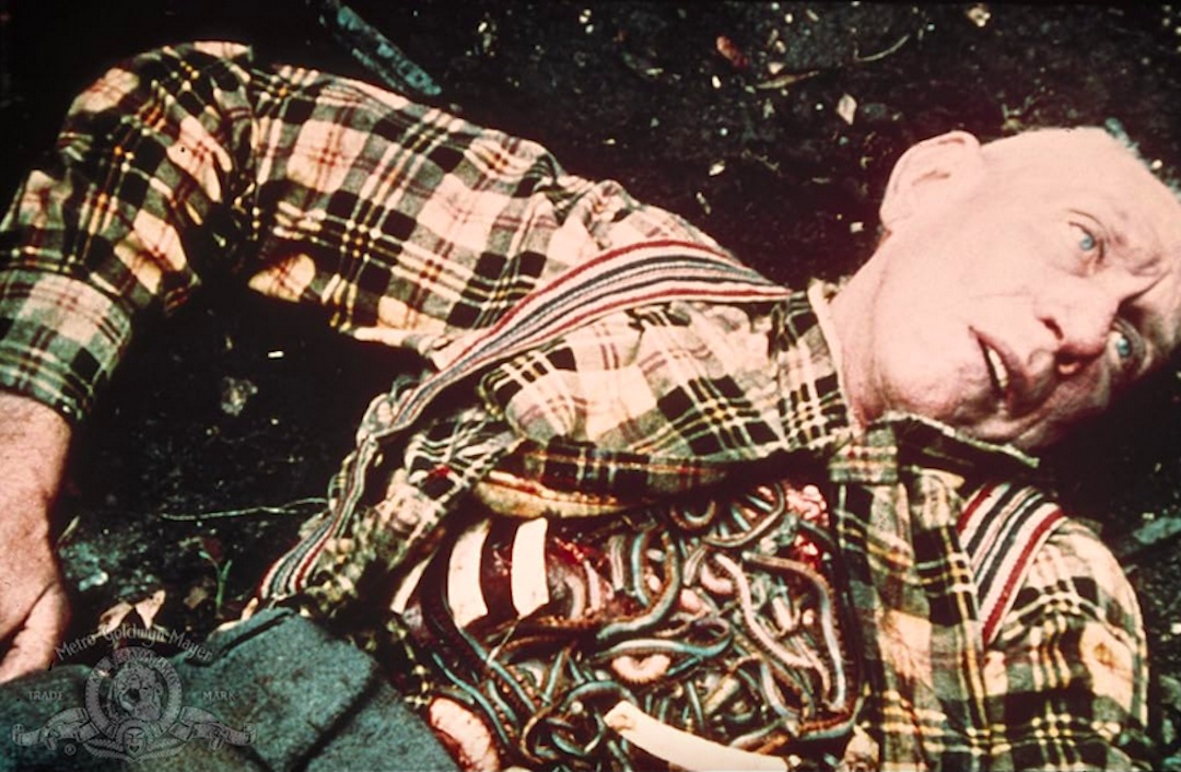 The unforgettable exclamation as the horror begins to dawn right from the beginning of the film: Mick at the diner as an unwanted outsider: “There’s a worm in my egg cream!” Mick gets his lip viciously bitten by one in his glass at the unfriendly town’s local diner.