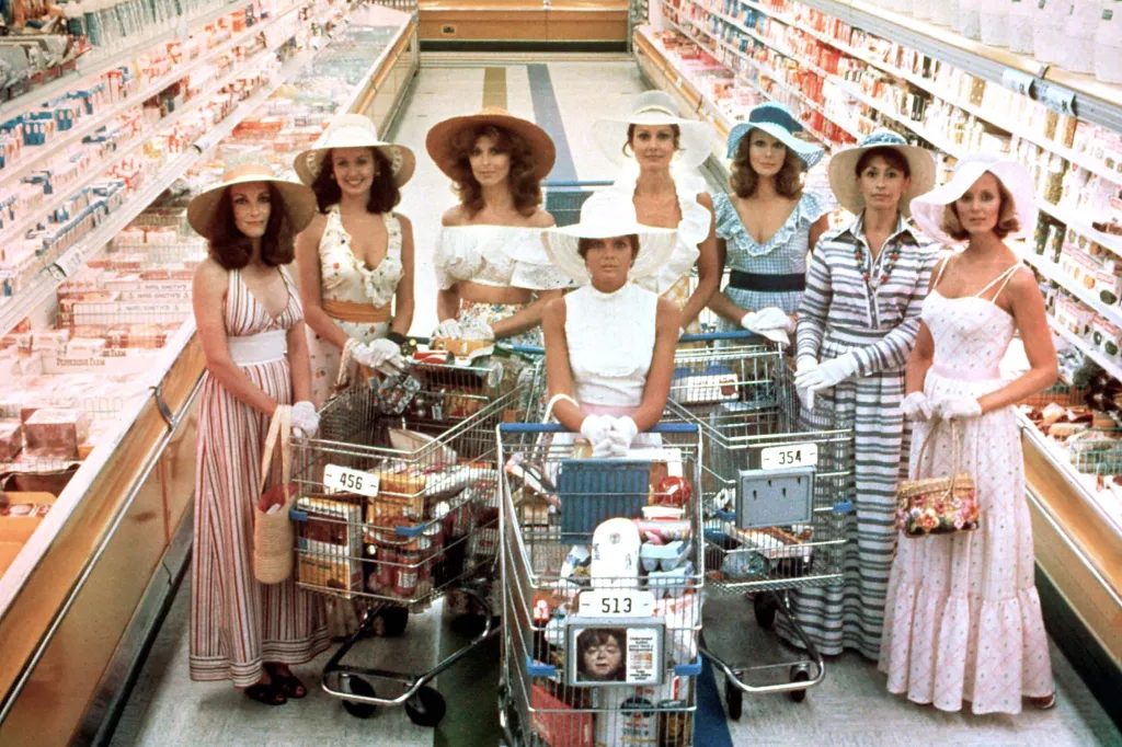 The scene devolves into a heated debate about the merits of spray starch—“All I said was, I prefer Easy-On,” one wife chirps, never straying off-script. Joanna and Bobbie, sensing something unnatural, investigate, uncovering that many Stepford wives were once vibrant feminists, their vitality now traded for a robot-like, domesticated, mind-numbing bliss, whose only purpose is to satisfy the men in their lives.