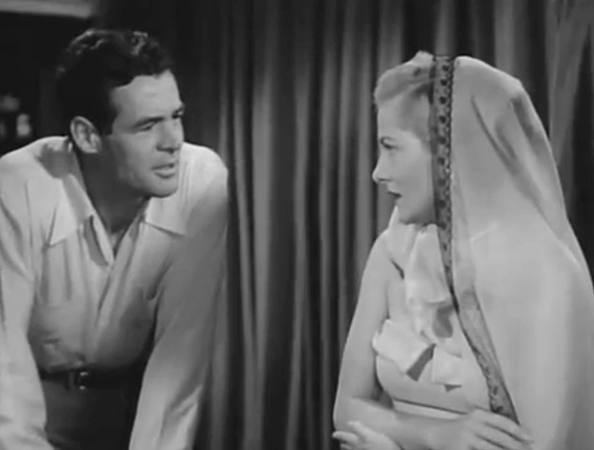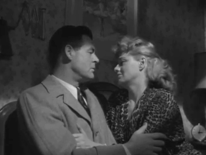 Earle lives with Lorry while she supports him, which works on his ‘masculine integrity.’ Picking up the dry cleaning and being asked to babysit the neighbor’s baby undermine his identity as a strong male. When Earle meets the enticing neighbor Gloria Grahame whose husband leaves her alone a lot, he’s abrupt as he answers the door bare-chested like an uncivilized brute sending her away.