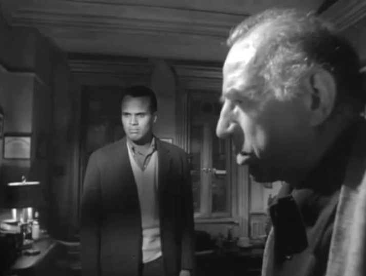 The film has noir criminal elements. Ed Begley plays Dave Burke, an ex-cop gone ‘bad’, having served time and living now in the lonely confines of his dingy apartment. Dave is bitter and dejected and just wants to pull a simple bank robbery and make an easy steal so he can get away from his dismal existence. He wants to enlist white racist ex-con Earle Slater and black Harlem Jazz musician and gambler Johnny Ingram (Harry Belafonte) to assist him. At first, both men bristle at the idea and say they don’t want in. But Ingram’s got the mob breathing down his neck, and Earle is tired of his girlfriend Lorry supporting him. Burke gets mobster Bocca to put the squeeze on Johnny, and Earle finally cracks up after a fight in a bar with a younger soldier (Wayne Rogers) who challenges him in the bar, calling him once again “old veteran’ he becomes riled to action. He then disagrees with Lorry, which ends with her agreeing to call himself ‘old.’ “They’re not gonna junk me like an old car.”