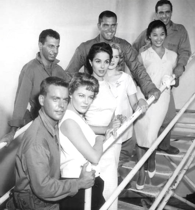 Bradford Dillman is shown above with Christine Carère in A Certain Smile (1958). His next film was In Love and War co-starring Mort Sahl, Dana Wynter, Jeffrey Hunter, Robert Wagner, Sheree North, Hope Lang, France Nuyen, and Bradford Dillman as Alan Newcombe. In 1944, the film tells the stories of three Marines and the effect the war had on their personal lives.