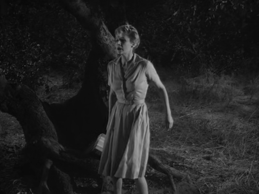 George wanders off, leaving Jenny sleeping under newspapers used as a blanket. He stumbles onto the town’s young stunner Lola Penderwaller (Cathy Merchant plays Lola and had a brief screen career from 1961 to 1965 that included roles in four episodes of The Alfred Hitchcock Hour and a part in Roger Corman’s The Haunted Palace 1963), who is a spirited flirt boasting her beautiful body in a scant swimsuit. Director Herschel Daugherty subtly emphasizes the contrast between Lola and his dowdy wife Jenny, who is back on the blanket, snoring like a truck exhaust, and oblivious. Lola teases George, leading him on only to a certain, harmless point, offering him a beer. When George gets sexually aroused, he tries to grab a kiss, and Lola rebuffs his advances. The normally gutless George violently slaps her and proceeds to choke the life out of her.