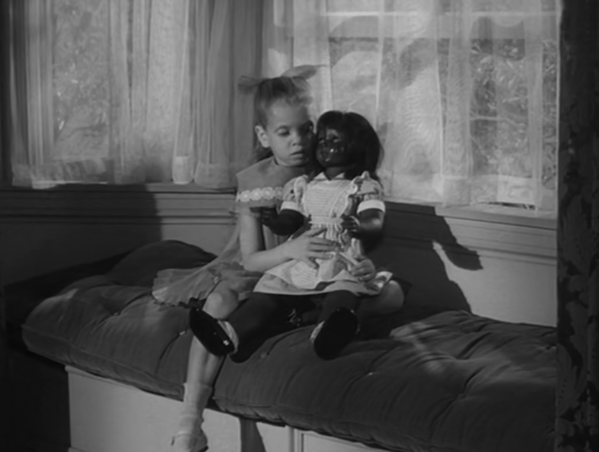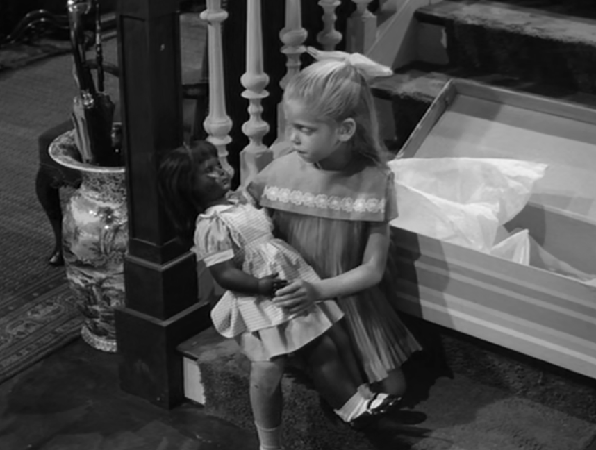 “After viewing this episode, I wondered whether Numa was on the market in or around 1965 or if she was a mere set doll. After viewing the episode, taking and examining the still shots, I believe Numa was a flirty-eyed white doll painted black/brown. Interestingly, the dress and hairstyle of Lila Perry are quite similar to that of Patti Playpal dolls.” – Debbie Began Garrett