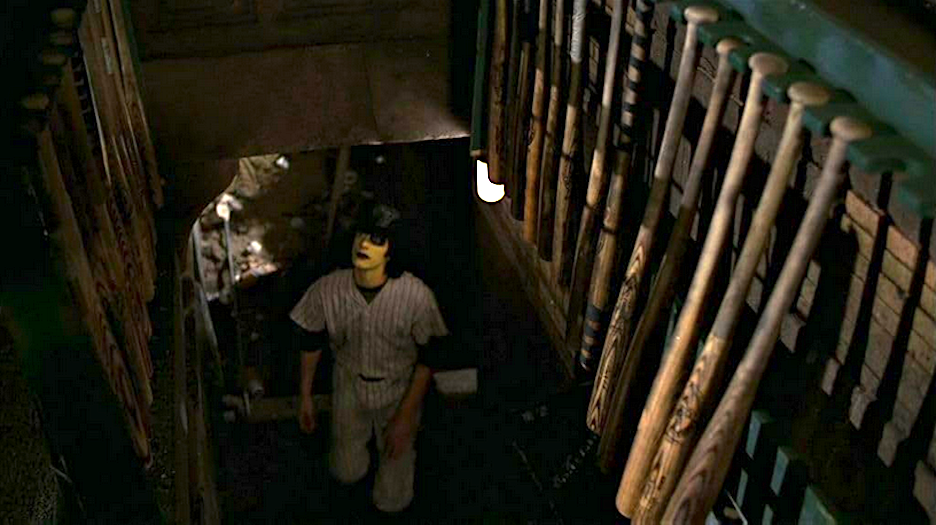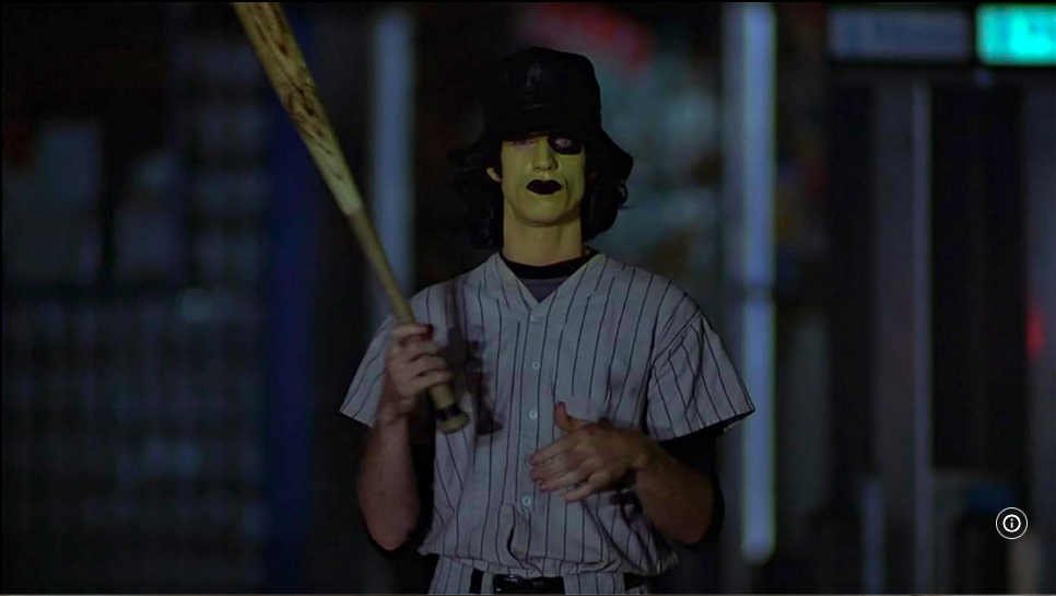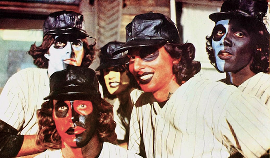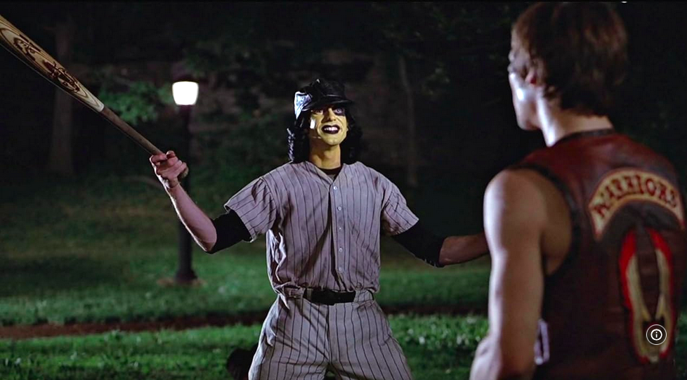 As if their sartorial choices weren’t eye-catching enough, they wield baseball bats as their weapons of choice, further blurring the line between sport and street violence. Adding to the visual spectacle, the Furies’ Main Lieutenant takes the baseball motif to an almost absurd level. His face, adorned with vibrant yellow paint, creates a stark contrast against the team’s navy and white color scheme. The Baseball Furies gang face paint was inspired by the makeup of KISS.