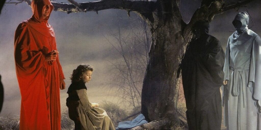 Jane Asher’s character, Francesca, winds up at Prince Prospero’s castle after a brutal encounter in her plague-stricken village. When Prospero arrives and is confronted by Francesca’s father, Ludovico, and her lover, Gino, he responds with characteristic sadism. Despite Francesca’s pleas for mercy, Prospero orders the village burned and forcibly takes Francesca, along with her father and Gino, back to his castle as prisoners. His intent is not only to use them for his own entertainment and dark intellectual games, but also to corrupt Francesca’s innocence within the decadent walls of his fortress. Once inside, Francesca is separated from her loved ones, dressed in fine gowns by Prospero’s mistress Juliana, and thrust into a world of masked revelers, Satanic rituals, and moral peril, her fate entwined with the prince’s sadistic whims and the looming threat of the Red Death.